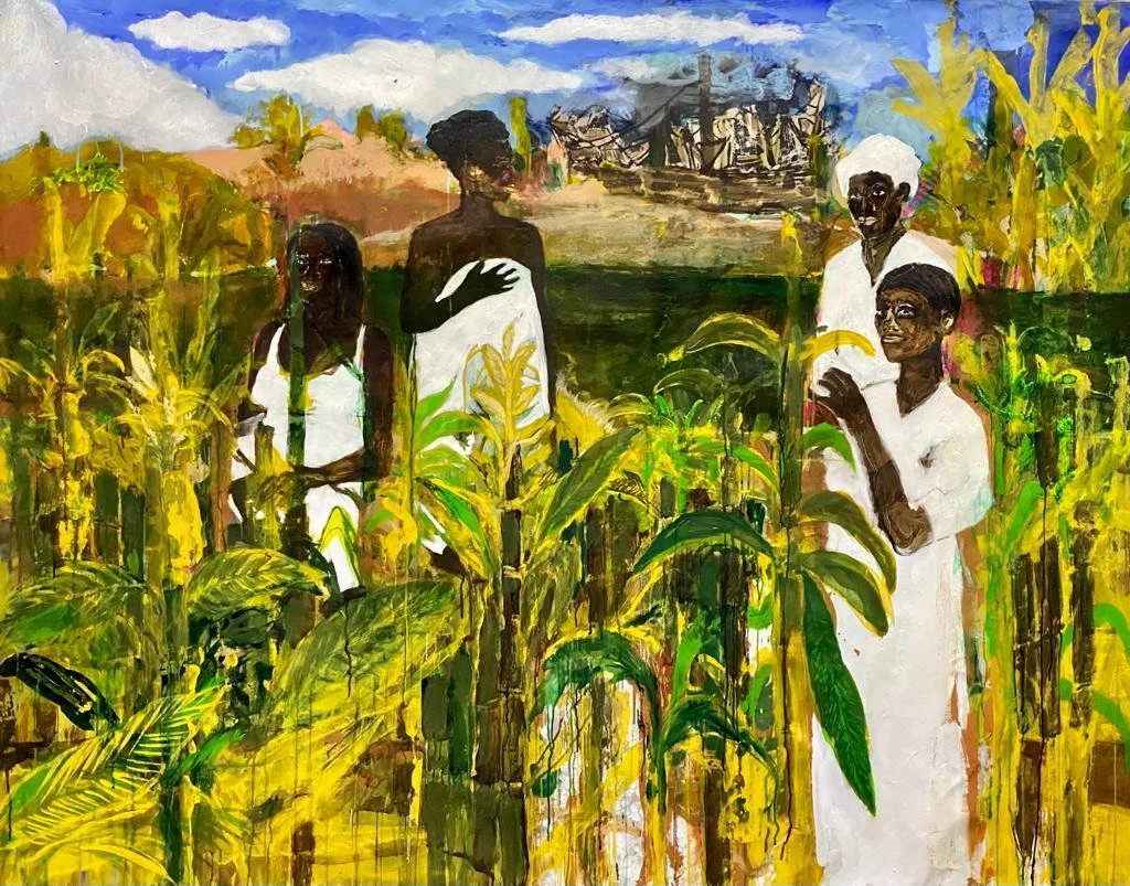 Le thème féminin de l’exposition y tient lieu de métaphore – on y lit la préservation des racines, du lien à la terre ou à la mer nourricières et à des traditions qui permettent un ancrage solide pour mieux projeter sa vision du futur. Le futur d’un continent où la solidarité des communautés reste une valeur fondamentale, dont les femmes se font les garantes. Les deux artistes usent de techniques picturales singulières, par strates et une approche presque photographique pour l’un, par la décomposition des traits et le traitement abstrait pour l’autre, pour mieux rendre l’archéologie des mémoires collectives et des histoires en marche, traversées de mutations sociales et de récits de résilience.